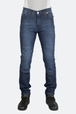 All’interno sono rinforzati con fibra aramidica DuPont™ Kevlar® e uno strato di Aranium®, che rende i jeans resistenti e conferisce loro un’enorme resistenza alla lacerazione. I pantaloni hanno anche protezioni D3O® sulle ginocchia regolabili in altezza.