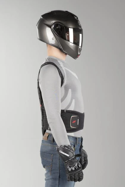 È fabbricato in E.V.C. (Evoluted Viscoelastic Cells), innovativa gomma idrorepellente anti-shock ad alto rapporto performance/peso/spessore. Le scocche sono congiunte da un sistema lamellare che garantisce la distribuzione del colpo in tutta la superficie della protezione. Questo paraschiena segue i movimenti naturali della schiena e ha un’ampia cintura renale che lo mantiene saldamente in posizione.