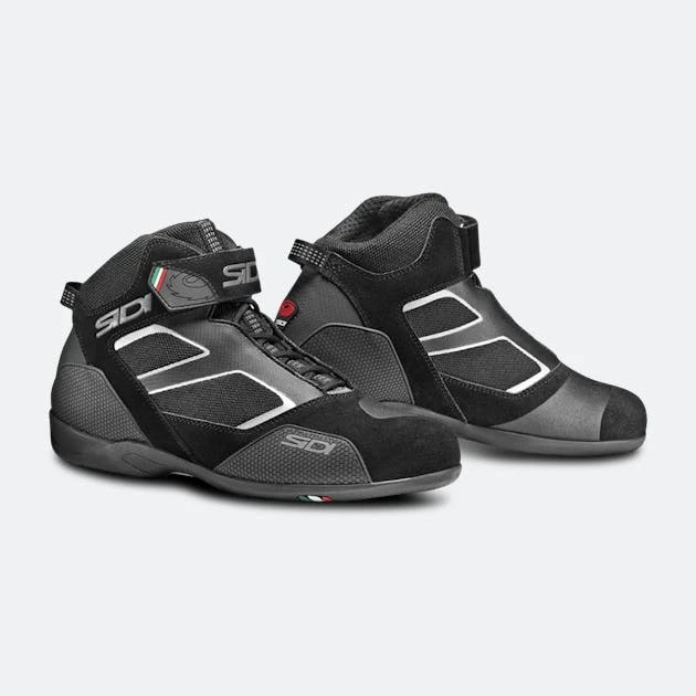 Le scarpe da moto Sidi Meta combinano un design sportivo con un’elevata sicurezza. La tomaia è realizzata in pelle scamosciata con numerosi rinforzi e con inserti riflettenti per garantire un’elevata visibilità .